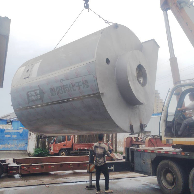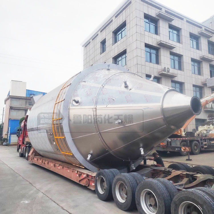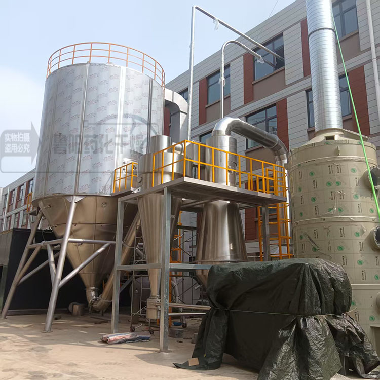 空氣經過濾和加熱,進入干燥器頂部空氣分配器,熱空氣呈螺旋狀均勻地進入干燥室。料液經塔體頂部的高速離心霧化器,(旋轉)噴霧成極細微的霧狀液珠,與熱空氣并流接觸在極短的時間內可干燥為成品。成品連續地由干燥塔底部和旋風分離器中輸出,廢氣由風機排空。