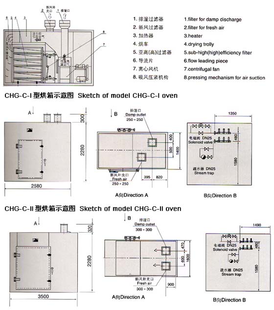 在傳統的水平流廂式干燥器中,氣流只在物料表面流過,其缺點是傳熱系數低、熱利用率差、物料干燥時間長,且由于結構的缺陷,無法完全符合“GMP”藥品生產規范。為了克服以上缺點,我廠根據國外先進技術設計開發了穿流式箱式干燥器。 本機由風機將一部分新鮮空氣經初、中、高三效過濾,達到十萬級凈化,經蒸汽熱交換器,使空氣升溫至一定溫度,通過過濾器使熱空氣凈化后,再由左側分流板分至各層,使熱風平均通過每層被干燥的物料。濕空氣從烘盤底下的傾斜風道抽出后,經離心風機使一部分濕空氣排出烘箱外,另一部分空氣繼續循環加熱,達到干燥目的。