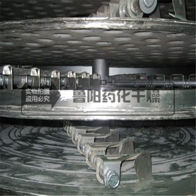 濕物料自加料器連續地加到干燥器上部第一層干燥盤上,帶有耙葉的耙臂作回轉運動使耙臂作回轉運動使耙葉連續地翻抄物料。物料沿指數螺旋線流過干燥盤表面,在小干燥盤上的物料被移送到外緣,并在外緣落到下方的大干燥盤外緣,在大干盤上物料向里移動并從中間落料口落如下一層小干燥盤中。大小干燥盤上下交替排列,物料得以連續地流過整個干燥器。中空的干燥盤內通入加熱介質,加熱介質形式有飽和蒸汽、熱水和導熱油,加熱介質由干燥盤的一端進入,從另一端導出。已干物料從最后一層干燥盤落到殼體的底層,最后被耙葉移送到出料口排出。濕份從物料中逸出,由設在頂蓋上的排濕口排出,真空型盤式干燥器的濕氣由設在頂蓋上的真空泵口排出。從底層排出的干物料可直接包裝。通過配加翅片加熱器、溶劑回收冷凝器、袋式除塵器、干料返混機構、引風機等輔機,可提高其干燥的生產能力,干燥膏糊狀和熱敏性物 料,可方便地回收溶劑,并能進行熱解和反應操作。