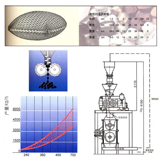 粉狀物料定量、均勻地加入軋片主料斗,使軋片主料斗內保持恒定的料位,然后由軋片主料斗內的縱向錐螺旋對粉料進行預壓縮并輸送至兩只壓輥的弧形槽口的物料咬入槽內并瞬間強制壓縮,物料經壓縮成形后承受的壓力逐漸減小,在其彈力及重力作用下,從槽內脫落,進入破碎整粒系統,然后根據用戶的粒度要求過篩、分級,得到符合質量要求的均勻顆粒狀產品。篩下粉重新返回料斗循環利用。(在壓塊時,粒狀物料在兩個反向旋轉的輥子之間被壓實,壓塊可使用粘結劑。)